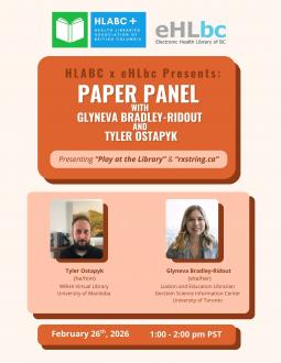 HLABC's second Continuing Education event will be a paper panel presented by Glyneva Bradley-Ridout, Liaison and Education Librarian at Gerstein Science Information Center and the University of Toronto, and Tyler Ostapyk, Library at the WRHA Virtual Library at the University of Manitoba. The panel will discuss two topics: creating space for play in academic libraries and the tool rxstring.ca, which produces search strings containing the various brand names and synonyms used for a particular drug for usage in bibliographic databases.